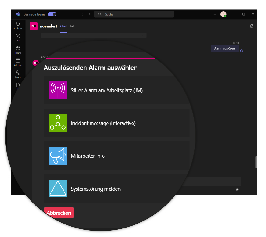 Alarme in Einzel- oder Gruppenchats, Teams-Kanälen oder als adaptive Karten.